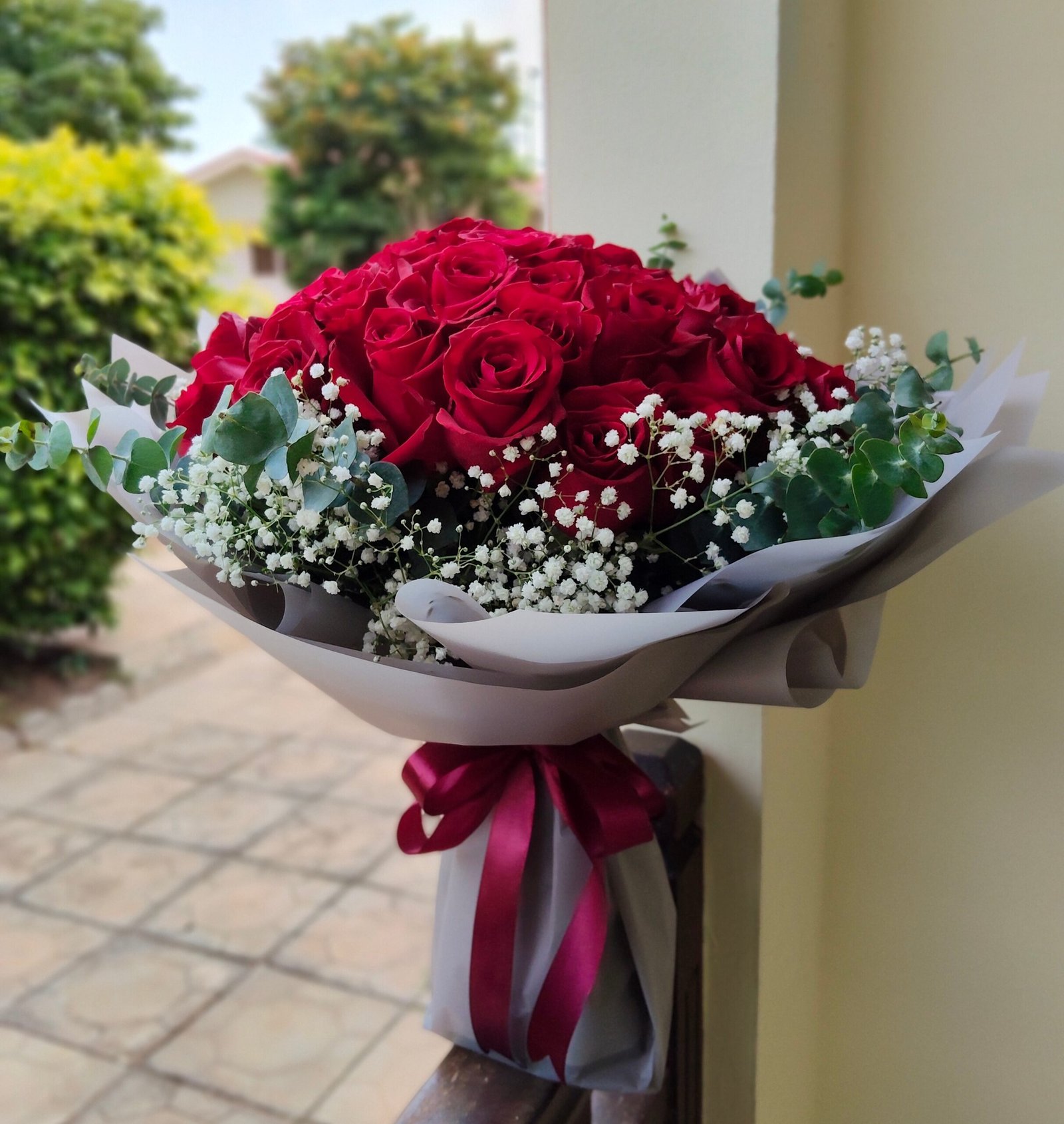For the one who leaves you breathless: An enchanting mix of deep red roses and hypericums, softened by a cloud of delicate white baby’s breath. Fragrant eucalyptus completes this bouquet for a sensory treat! It’s the perfect way to tell them they are the center of your universe.